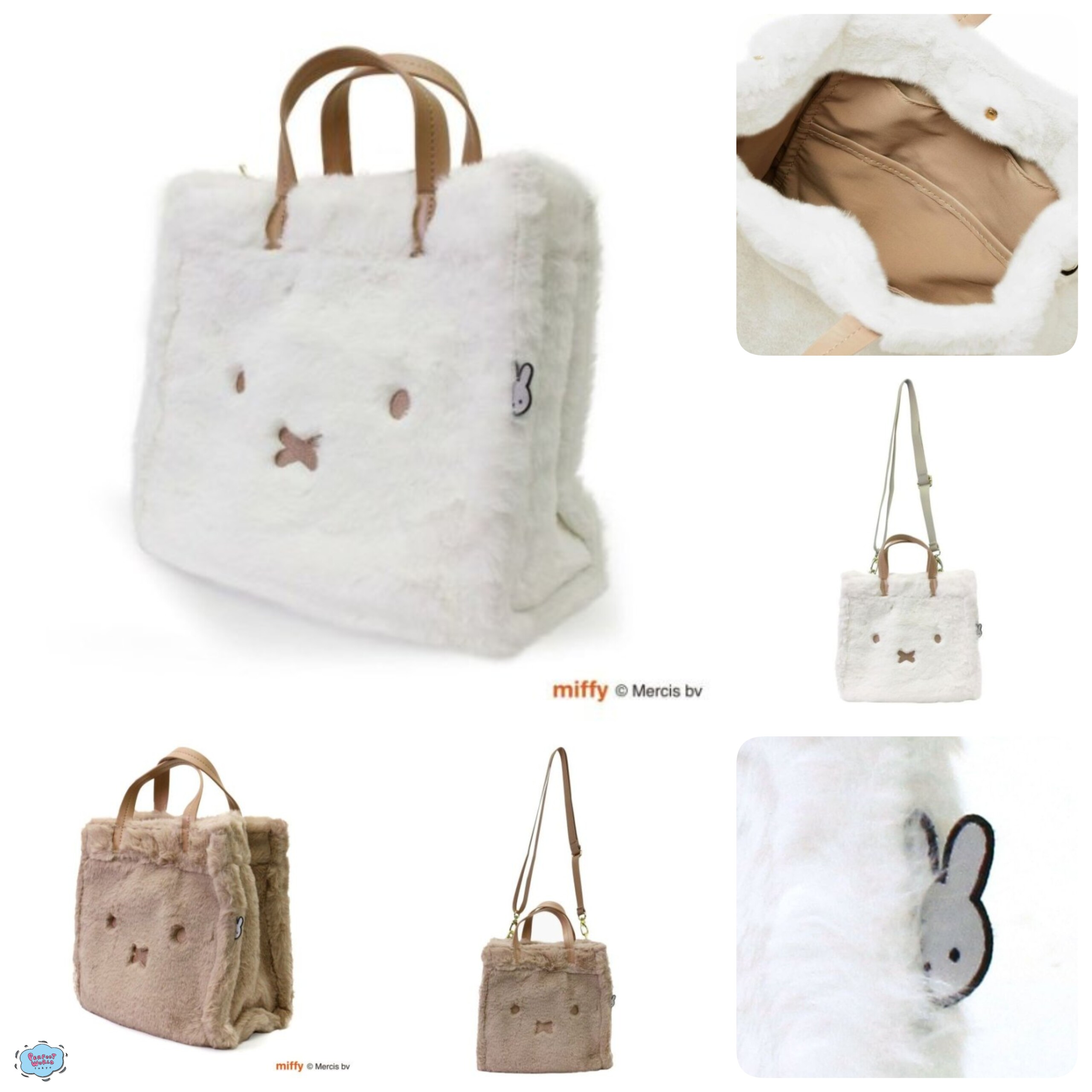 푹신푹신한 모피 소재 속에서 살짝 얼굴을 내밀고 있는 미피의 태그가 살짝 보이는 느낌에 반해버렸어요! 토트백은 양쪽 끝에 숄더백으로 사용할 수 있도록 벨트를 탈부착할 수 있도록 되어 있어 편리하답니다.