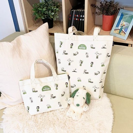 다음으로 소개할 것은 이 미니 토트백입니다. 심플하고 중성적인 그린 컬러가 주를 이루고 있어 남녀노소 누구나 사용할 수 있습니다. 스누피 이외의 캐릭터도 프린트되어 있어 다양하고 활기찬 느낌을 줍니다.